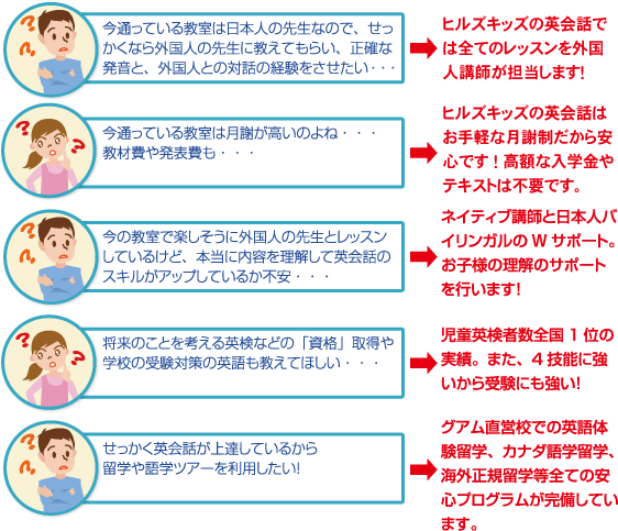 これまで下記のような保護者の皆様のお悩みを解決するために、乗り換えキャンペーンをさせていただいております。