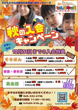 ヒルズキッズでは9月1日から10月31日まで「秋の入会キャンペーン」を実施中です。